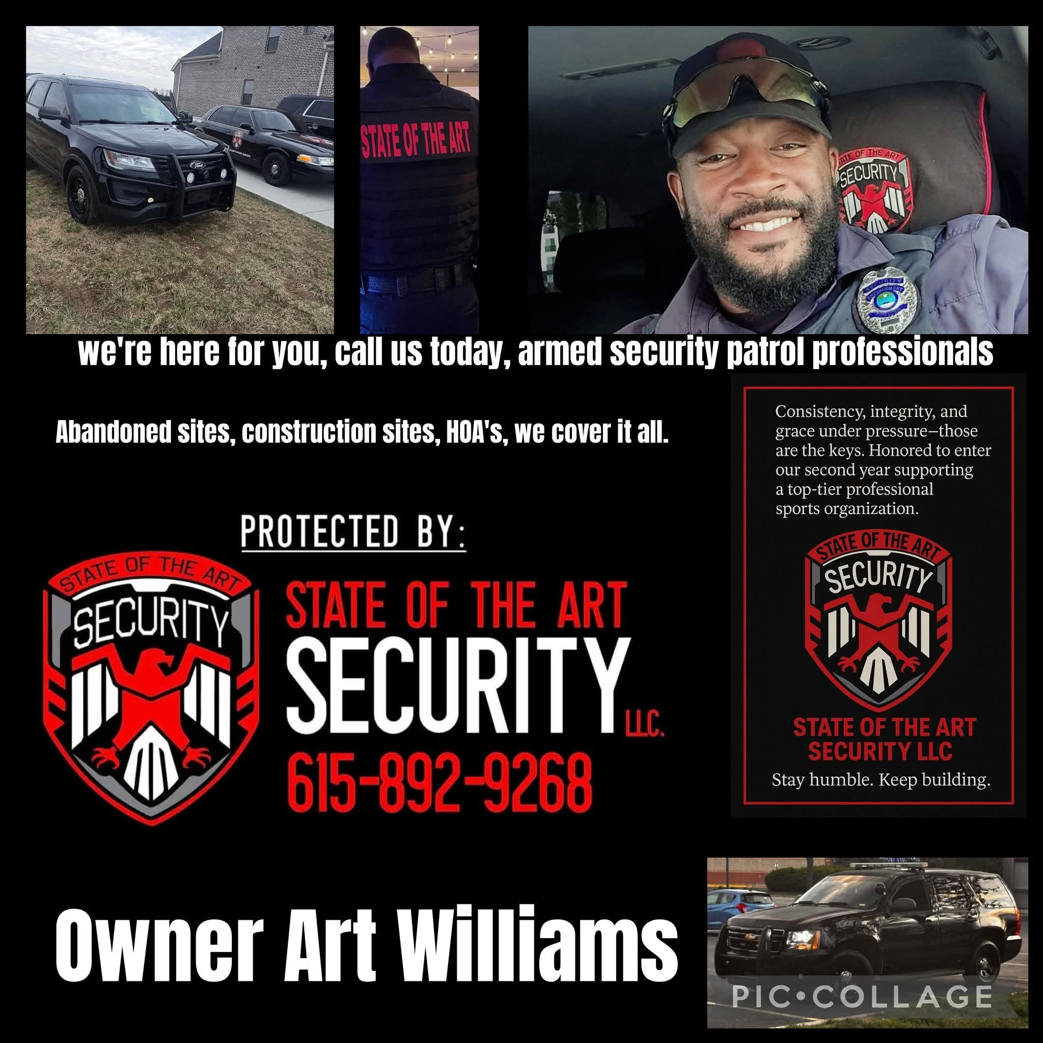 State of the Art Security LLC is a Murfreesboro-based private security company known for providing professional armed and unarmed security, mobile patrols, executive protection, and site surveillance across Middle Tennessee. We specialize in construction site protection, residential and commercial property security, and high-profile event coverage—including work for national brands, professional sports organizations, and large-scale developments.
