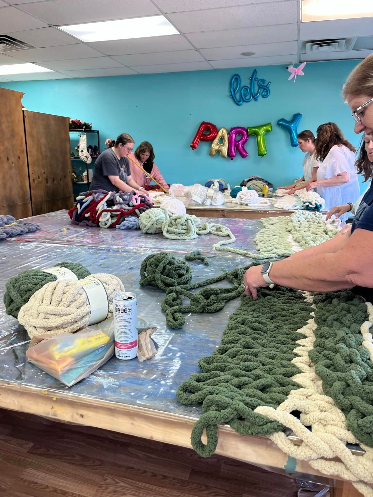 We also host a variety of Public Workshops! Everything from Sign Making, Liquid Glass, Chunky Knit Blankets, Candle Making, Murder Mystery Parties, and so much more! Every week we host a ton of children’s parties. We have a lot of options available for these including our ceramics, wood signs, stuff-a-friend, stuffa squishie, splatter den, and more!