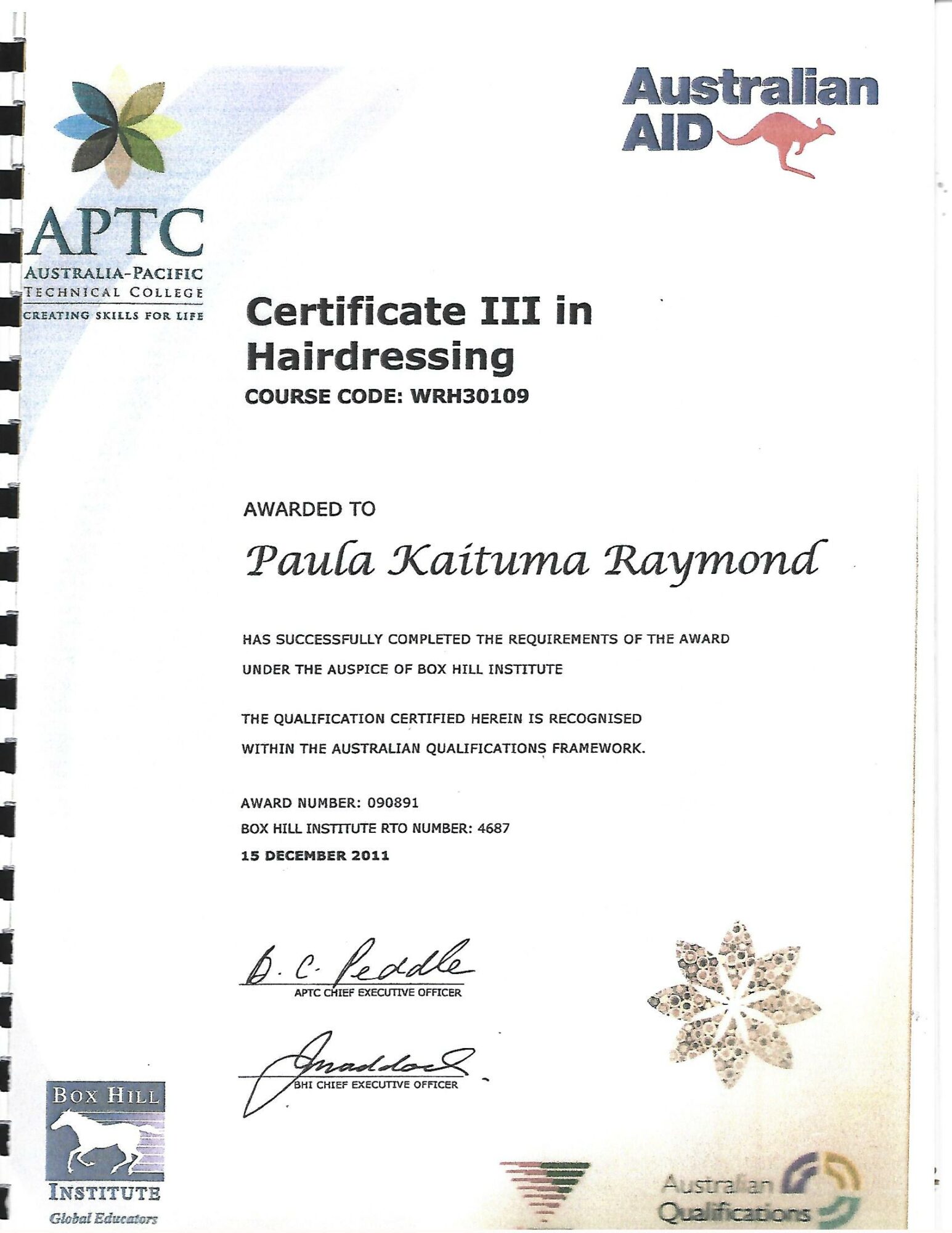 Then, in 2011, I received a scholarship from the Australia Pacific Training Coalition for a Certificate III in Hairdressing in Suva, Fiji. Trained by Kylie Kersell from New Zealand, I gained international experience — even styling models for the Fiji Fashion Show and Miss Universe Australia. That training built my confidence further, and I received a special award for my performance.
