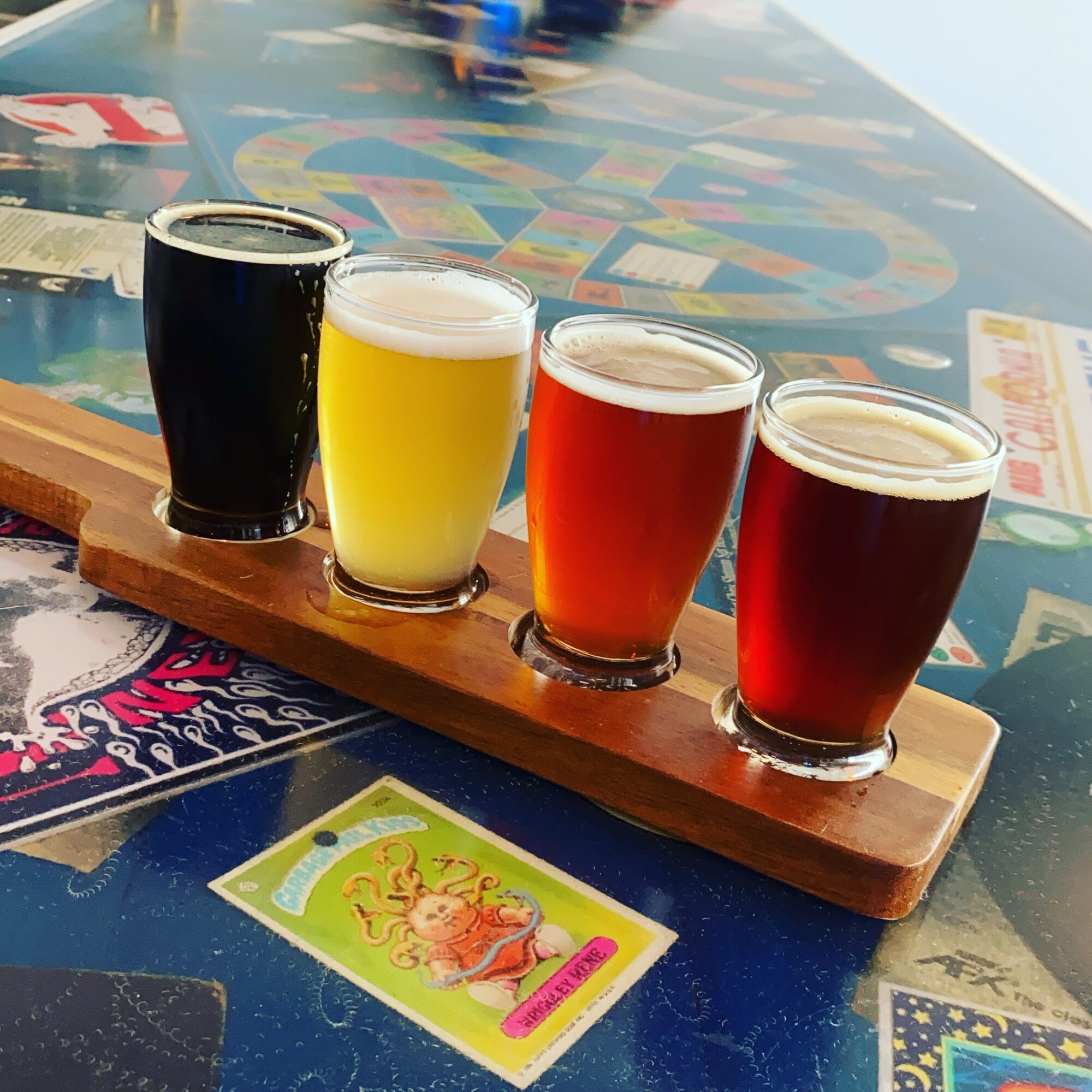Our taproom seats 72 and has a distinctive retro theme that pays homage to the greatest decade of cinema and music–the 1980s. The bar top is made of see-through epoxy resin and is embedded with all sorts of memorabilia–albums, tapes, pins, VHS jackets, and coins from the 80s. The bar has been the subject of many important debates, such as the supremacy of either Schwarzenegger or Stallone in regards to 80s action films.