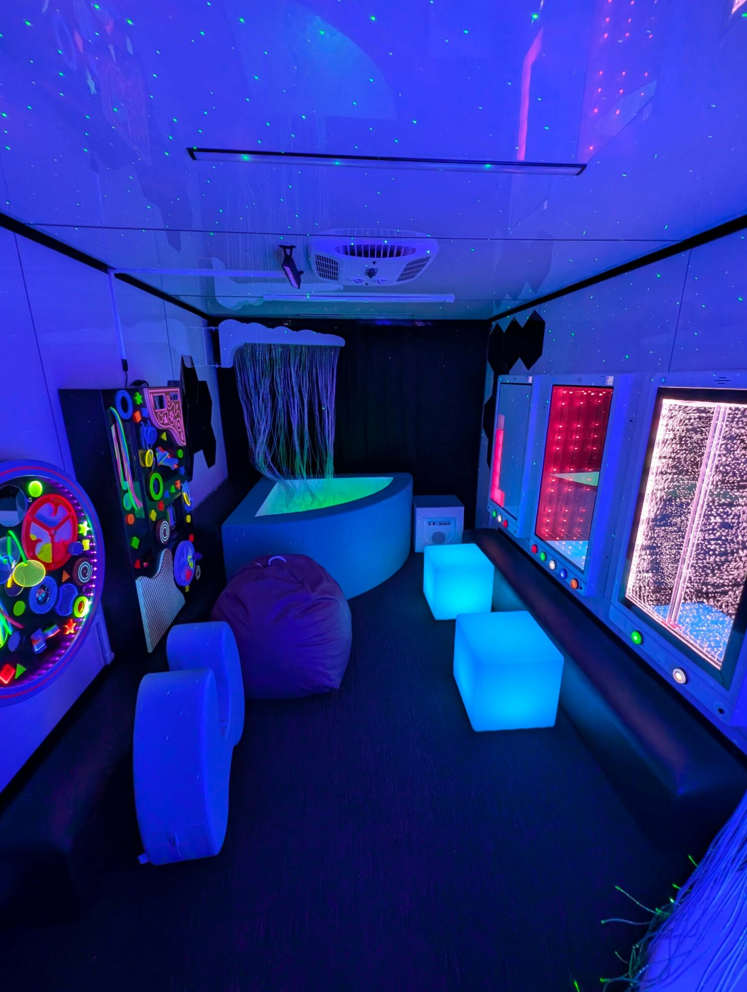 We decided to create the change we wanted to see. We custom-built a mobile sensory room inside a cargo trailer, packing it with everything a child might need to regulate. It features calming music, projections, fiber optic lights, mirrors, digital and tactile panels, and cozy corners. We even managed to fit a vibroacoustic ball pit in there!