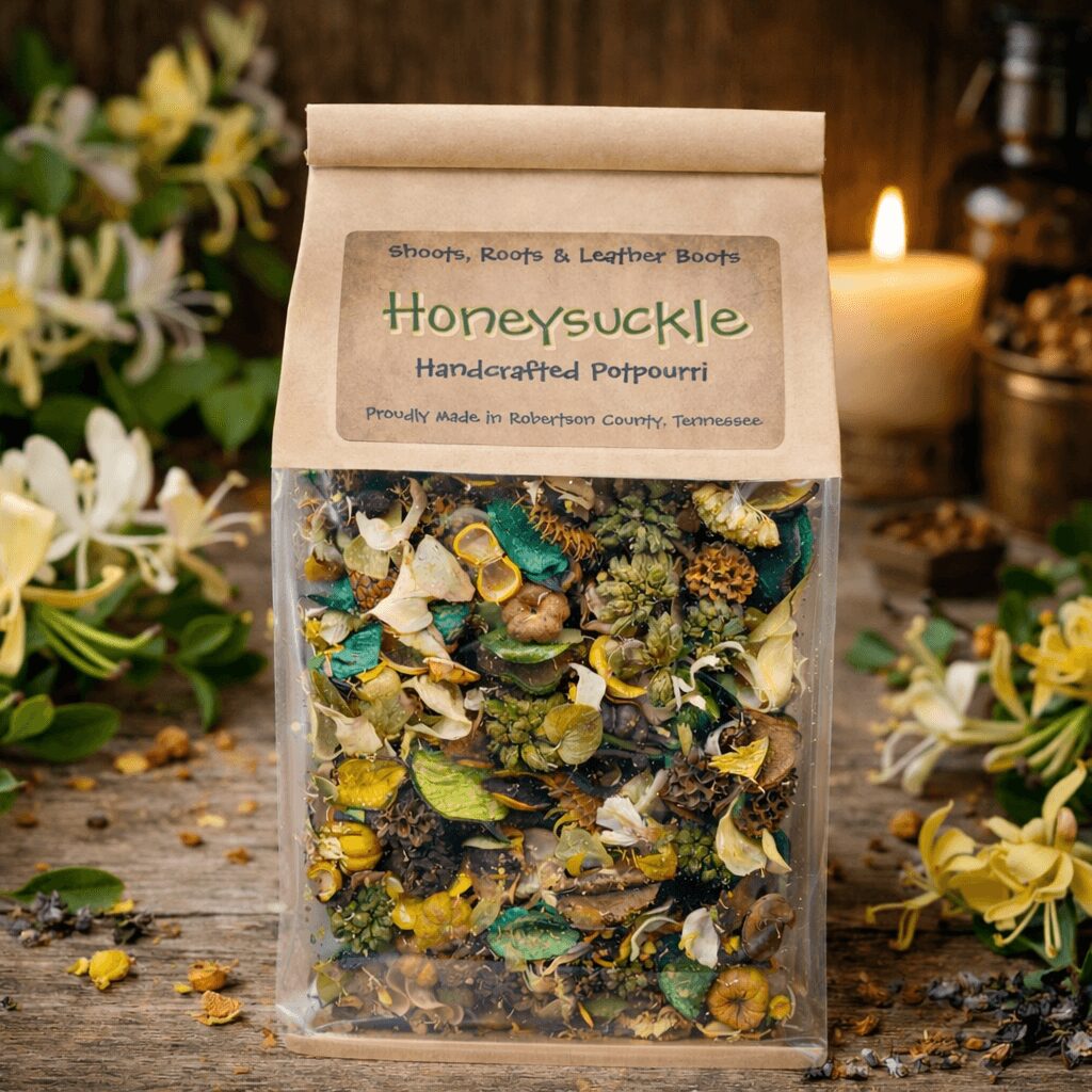 Today, my son and I handcraft every product we offer through our small business, Shoots, Roots & Leather Boots. Together, we create potpourri, simmer blends, wax melts, and botanical home fragrance inspired by the woods, fields, and changing seasons around us.