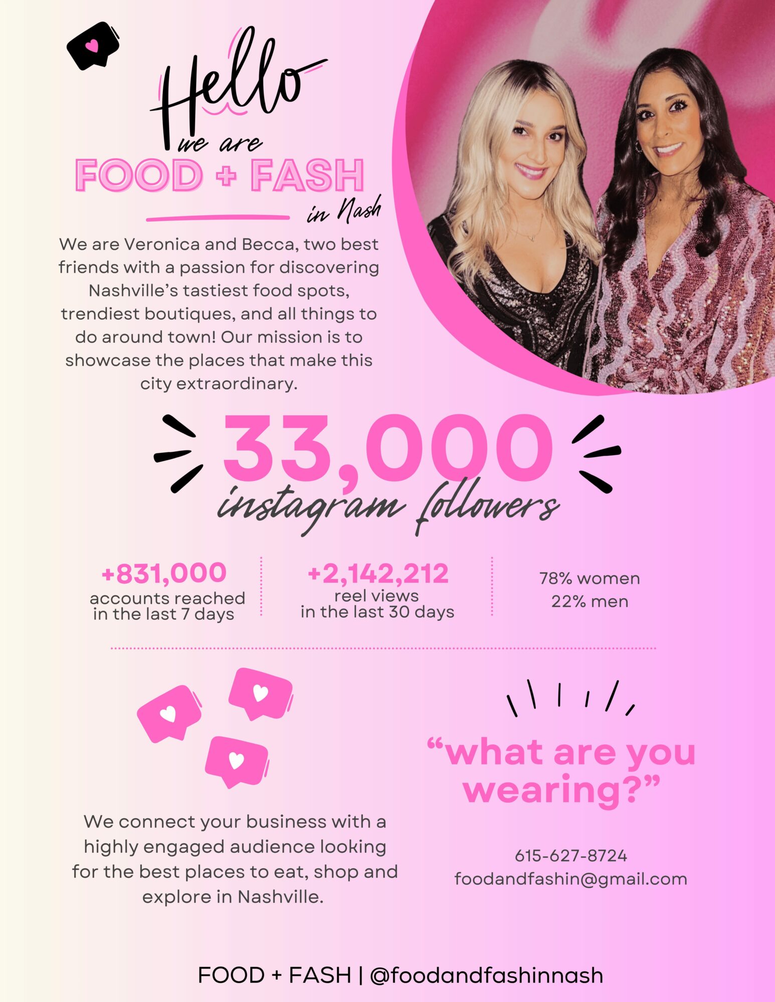 Food and Fash in Nash is run by us, 2 best friends, Veronica and Becca, and it all started from our shared love of finding the best places to eat, drink, shop, and explore around Nashville. What began as a fun hobby quickly turned into something we’re truly passionate about.